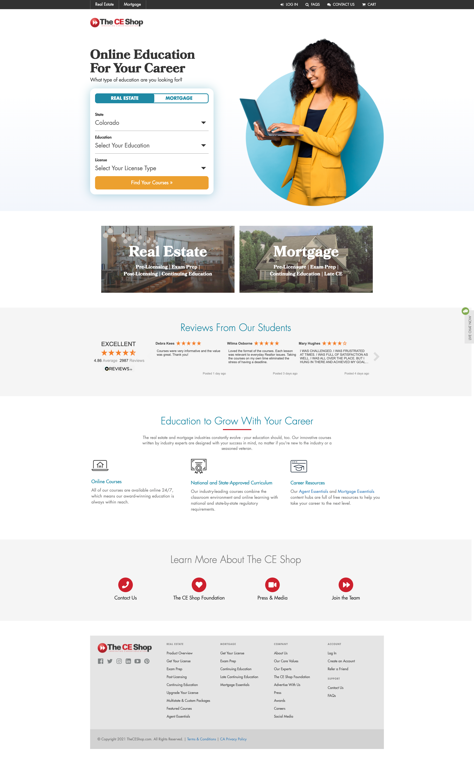 This is the general landing page for all Pre-Licensing real estate education products. It is made up of a course selector that is dynamic based on the products available in each state, an interactive state map to engage customers and prompt action, features of The CE Shop and our industry-leading products, a demo video, testimonials, and an interest form. I work with my web designers and the SEM team to A/B test and constantly improve the function and revenue-impacting features of this page, as well as the Customer service and Marketing Strategy team to ensure the user journey is in line with our company strategies.